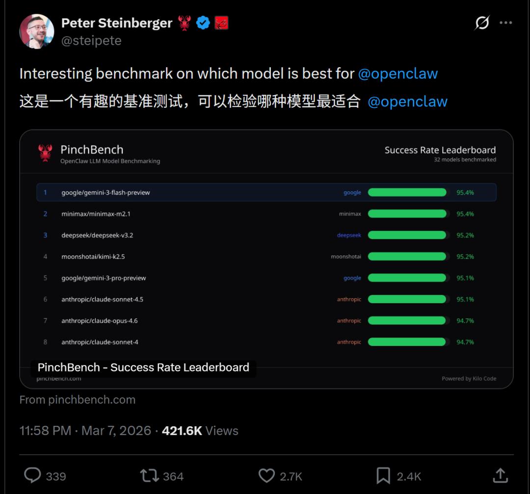 参考链接:[1]https://x.com/steipete/status/2030312187915309311[2]https://pinchbench.com/about?utm_source=chatgpt.com