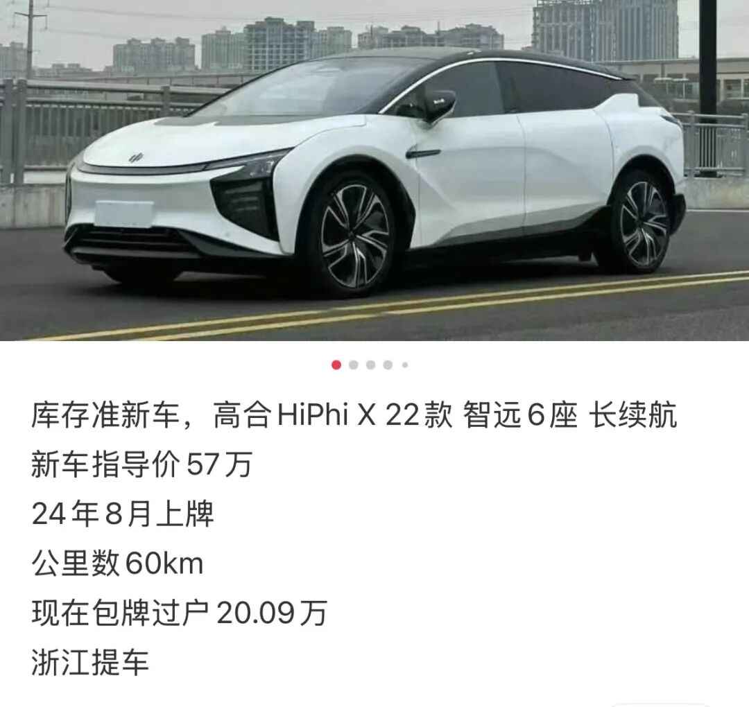 现在好了,车企暴雷之后,仓库里没卖出去的车,动不动就五折四折批发出去,6万块钱可以提走一台威马;原价20多万的极越,12万开回家;当然,最离谱的当属豪华品牌高合,原价60万,还不带选装,放在以前工薪族想都不敢想,现在烂尾车只要18到20万,甚至包过户。