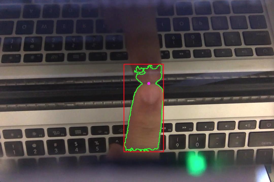 处理后的效果如下:绿色:手指 + 反射轮廓;红色:边界框;紫色:触摸点。