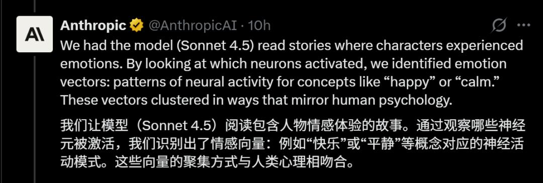 在Sonnet 4.5中,他们发现了AI情绪概念的内部表征,锁定了「喜、怒、哀、惧」的特定神经元,并且证实:这些情绪表征正在悄悄操纵AI的行为。