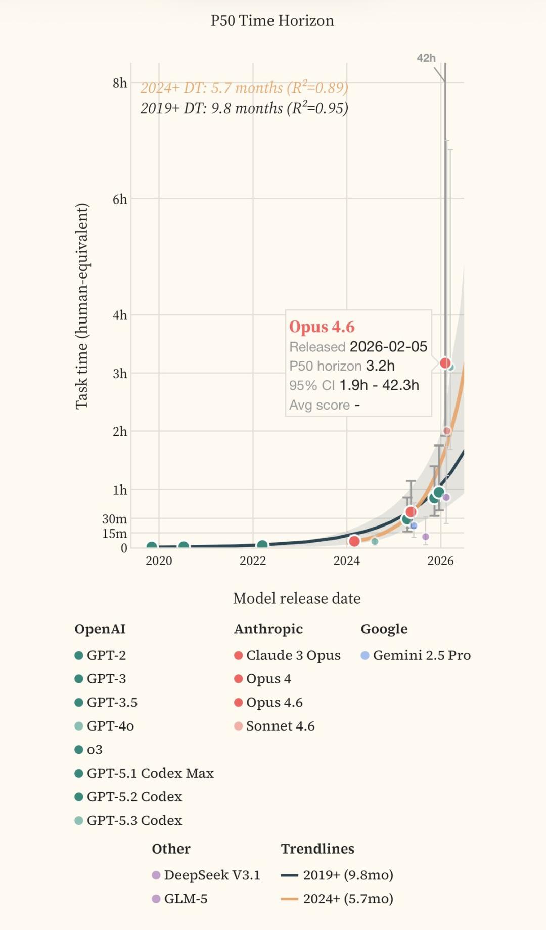 GPT-5.3 Codex和Opus 4.6,在2M token预算下就50%成功率干掉人类专家3小时任务。