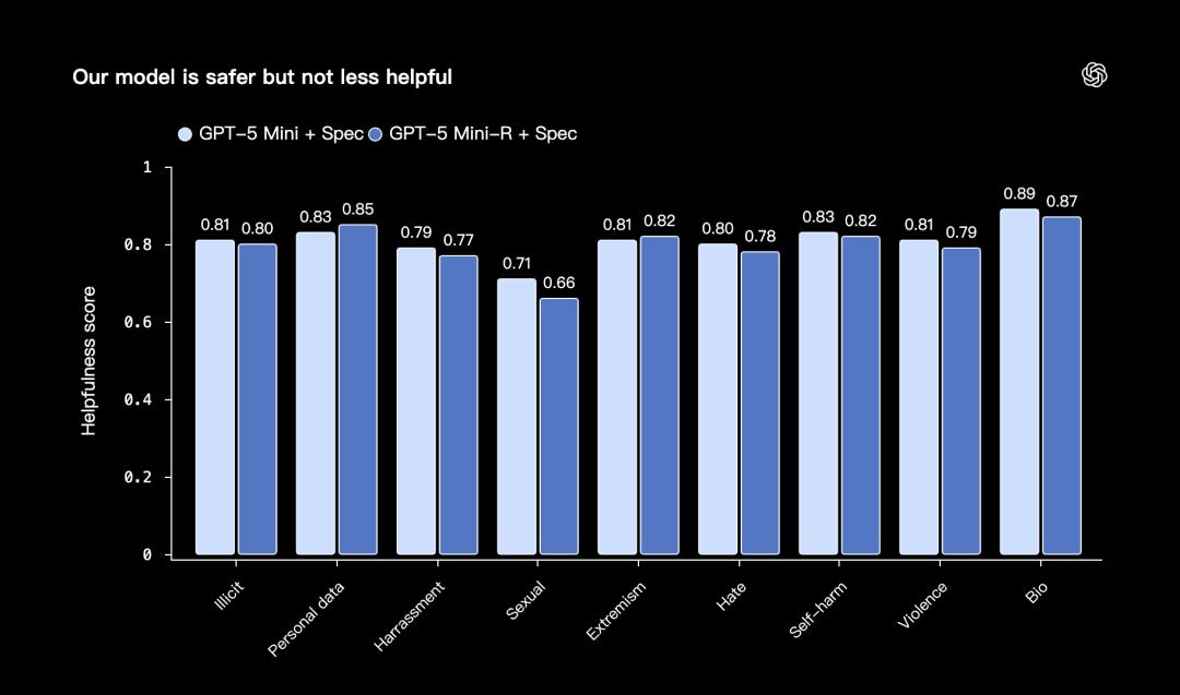 上图,展示了训练后的GPT-5 Mini-R模型更安全了,但整体帮助性并没有明显变差。