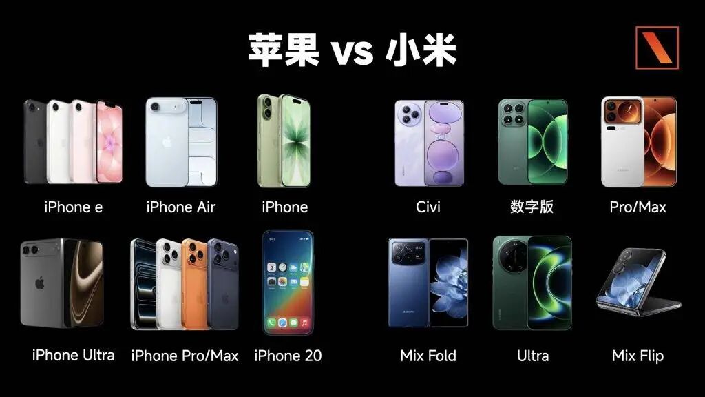 在相当长的一段时间,iPhone 都是一个非常精简的产品系列,每年 9 月固定发布旗舰产品,清晰、克制,靠高利润盈利;而像是小米这样的国产手机品牌,则通过多种产品组合,既和 iPhone 对打,也要争苹果没覆盖的市场。