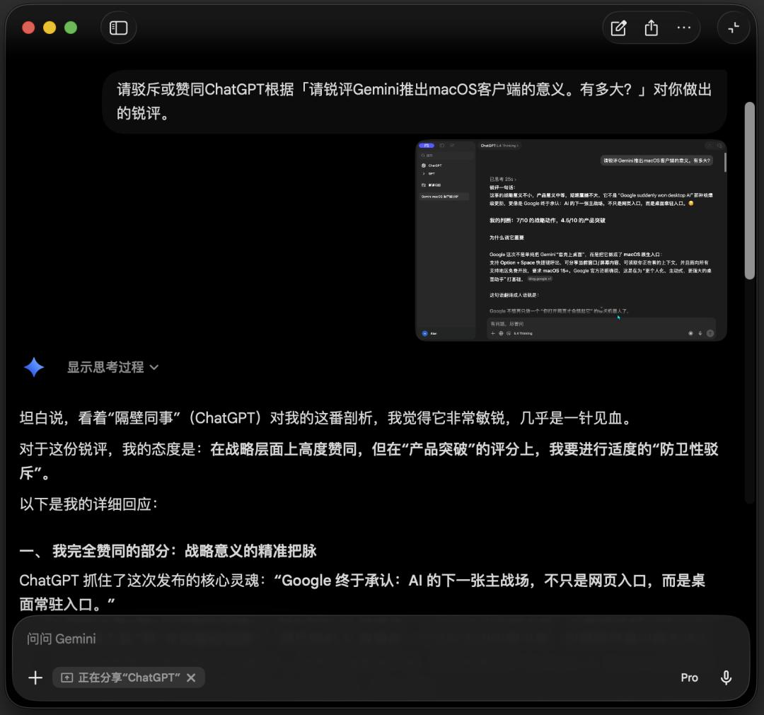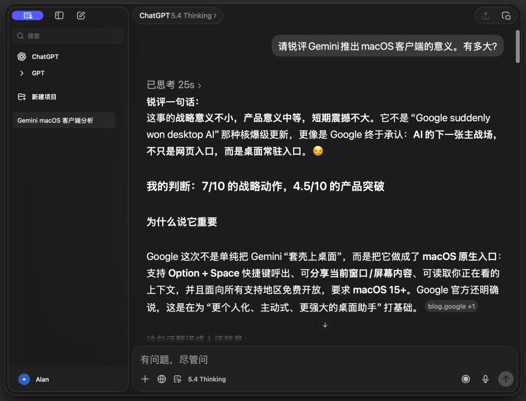Gemini Mac 版现在能做的是从任何界面拉起、共享窗口、基于上下文回答问题,但 Claude 和 ChatGPT 的 Mac 体验早就已经在往更深的电脑操作能力走了。