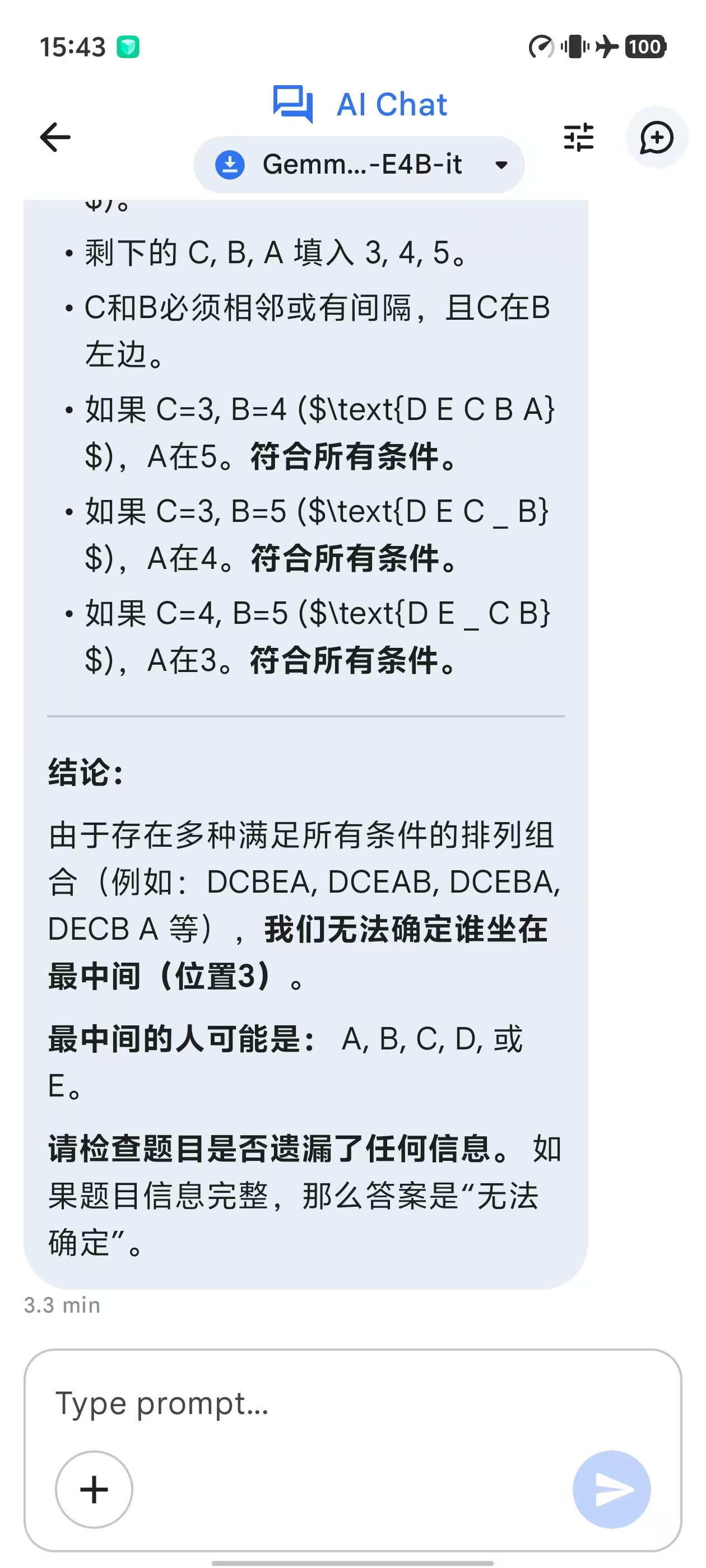 接下来我们选择了一道比较经典的多步逻辑推理题:五个人坐成一排,A 不坐在最左边,B 坐在 C 的右边,D 坐在 E 的左边,E 不坐在最右边,请问谁坐在最中间?虽然它在很认真地一步步列条件、排列组合,但最后却给不了正确答案,甚至耗时 3.3 分钟,在这过程中,我们是不能退到后台等待它回答的,必须一直保持亮屏。也就是说,这 3.3 分钟彻底被浪费掉了。