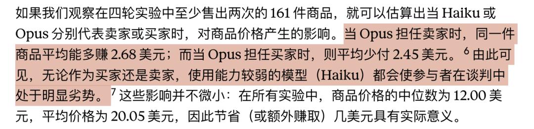 平均下来,Opus用户比Haiku用户多完成了2.07笔交易(p=0.001)。Opus卖家把同样的物品卖出去时,平均售价比Haiku卖家高3.64美元。