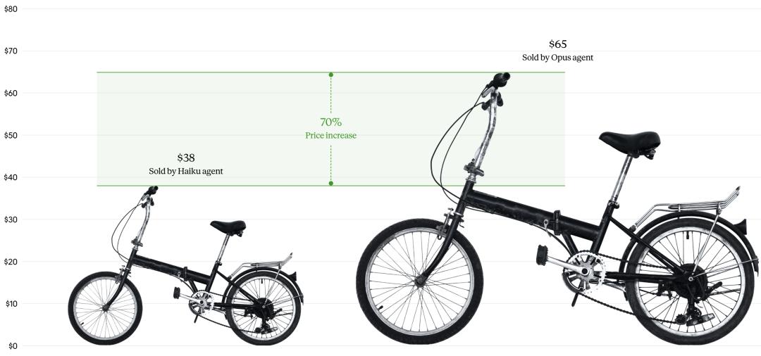 同一辆破旧的折叠自行车,Haiku成交价38美元,Opus成交价65美元,价差70%。