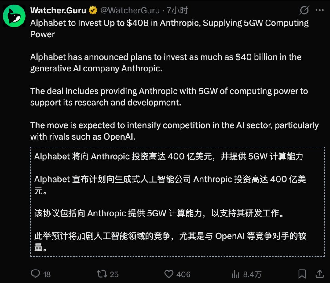 将向Anthropic投入最高400亿美元!