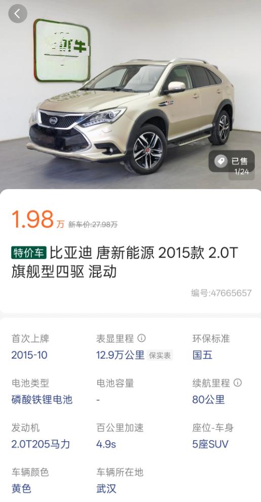 这次我看中的车是一台标价1.98万元的2015款比亚迪唐DM四驱旗舰版,也就是网友们口中的“老唐”。尽管车龄已经有十年,里程也达到了12.9万公里,但1.98万元的价格还是让我有点难以置信,因为当时该车在其他平台的标价普遍在2.5万到3.5万元之间。