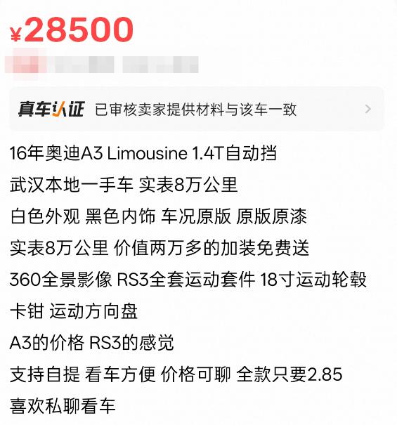 随后,我在某平台又看中了一台2016年奥迪A3 Limousine 1.4T自动挡,该车标价28500元,来自一位二手车贩子。