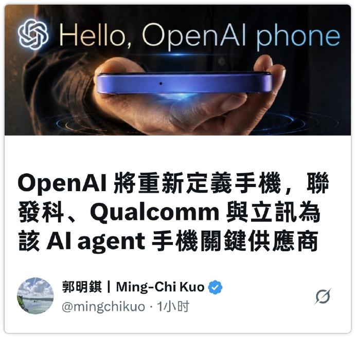 近日,天风国际证券分析师郭明錤透露,OpenAI正在自研手机,将与联发科、高通合作开发手机处理器,立讯精密为独家系统协同设计与制造商,预计2028年量产。