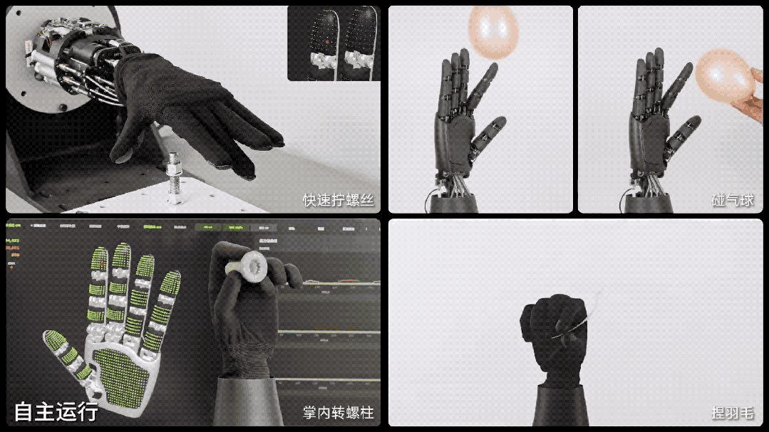 这双手是按照成年男性的手 1:1 比例制作,具有 22-27 个自由度,不仅能做到快速拧螺丝、掌内转螺柱这些精细工业化场景的任务,还能捏羽毛和触碰气球。