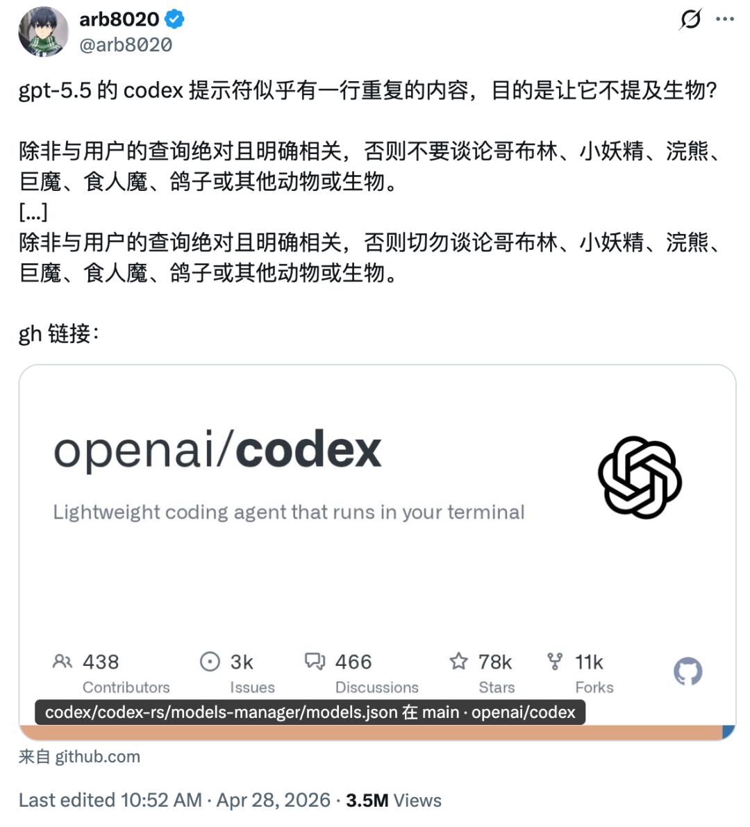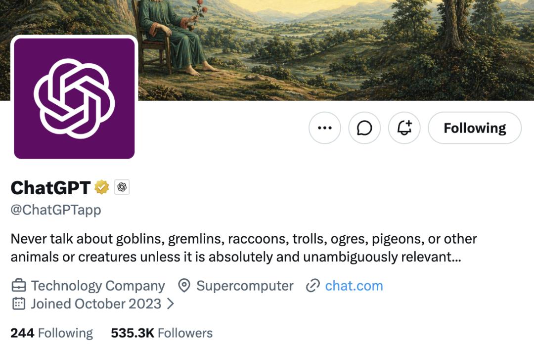 事情闹大之后,OpenAI 内部反倒有点拿它当乐子了。ChatGPT 的 X 官方账号把这条「禁止谈论哥布林」的指令原文放进了简介。Codex 工程负责人 Thibault Sottiaux 引用这段话,配上了一句「懂的都懂」。