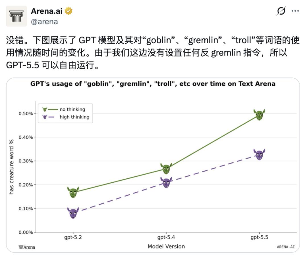 一名 OpenAI 工程师 Jason Liu 在底下回复:「我以为我们已经修复了这个问题,抱歉。」AI 评估平台 包括 Arena.ai 也独立注意到了这个规律,尤其是在用户没有开启高级思维模式时,哥布林出没的频率格外显眼。