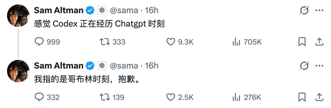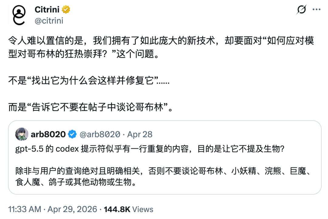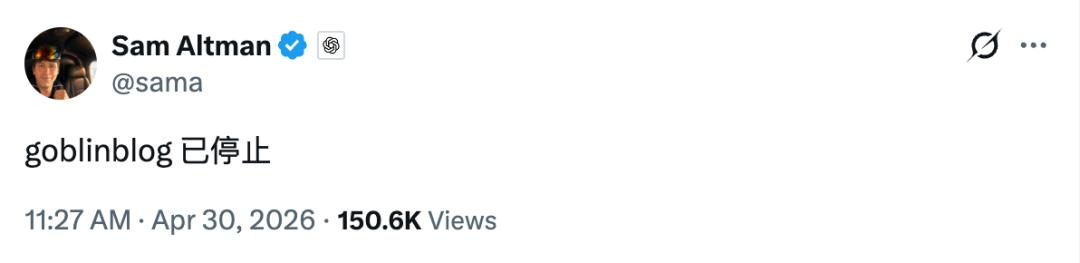 Sam Altman 昨天表示期待 GPT-6 能给他「多加几只哥布林」,随后又发文说 Codex 正在经历「ChatGPT 时刻」,发完自己又改口:「我是说哥布林时刻,抱歉。」刚刚则是发文宣告,问题已经得到解决了。