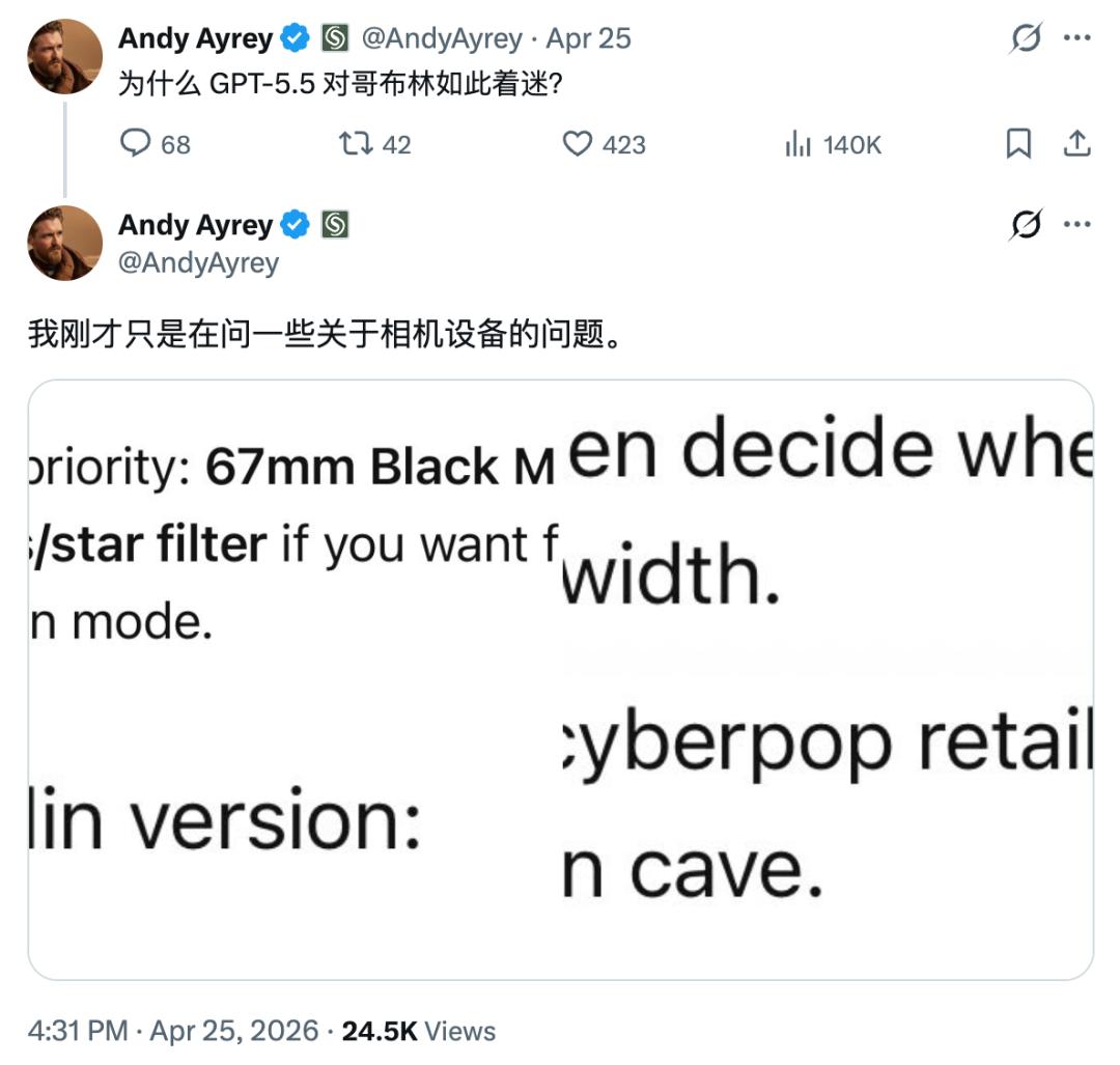 事情是这样的,如果你在今年高强度使用过 GPT-5 系列模型,你会发现它会在毫无征兆的情况下蹦出一句无关主题的「哥布林(goblin)」式比喻。比如有人问 AI 该买哪款相机,AI 给出的推荐语是:「如果你想要那种闪闪发光的霓虹哥布林模式,可以考虑这款。」