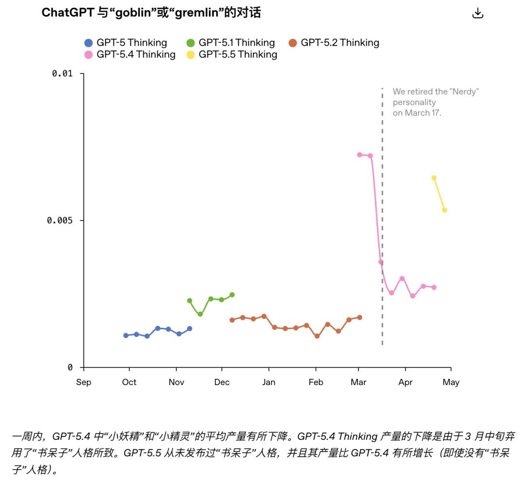 GPT-5.5 在发现这个问题之前就已经开始训练了,当它接入内部测试时,工程师们两眼一黑:这群哥布林不仅没清除干净,还安家了。