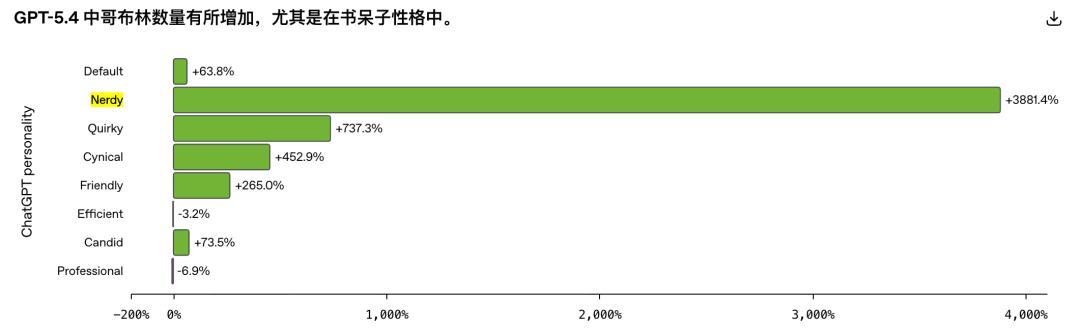 数据说明了一切。从 GPT-5.2 到 GPT-5.4,默认人格下「哥布林」的出现频率变化幅度只有负 3.2%,而「书呆子」人格下这个数字飙升了整整 3881.4%。「书呆子」模式虽然只占了 ChatGPT 总对话量的 2.5%,却贡献了 66.7% 的「哥布林」含量。