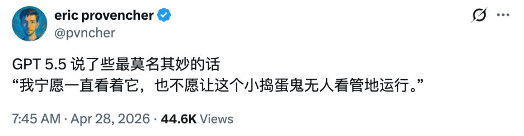 在外部,用户们早就察觉到了不对劲,Repo Prompt 创始人 Eric Provencher 在 X 上晒出截图,AI 在帮他处理代码时说了一句:「我宁愿一直盯着它,也不愿让这个小捣蛋鬼无人看管地运行。」
