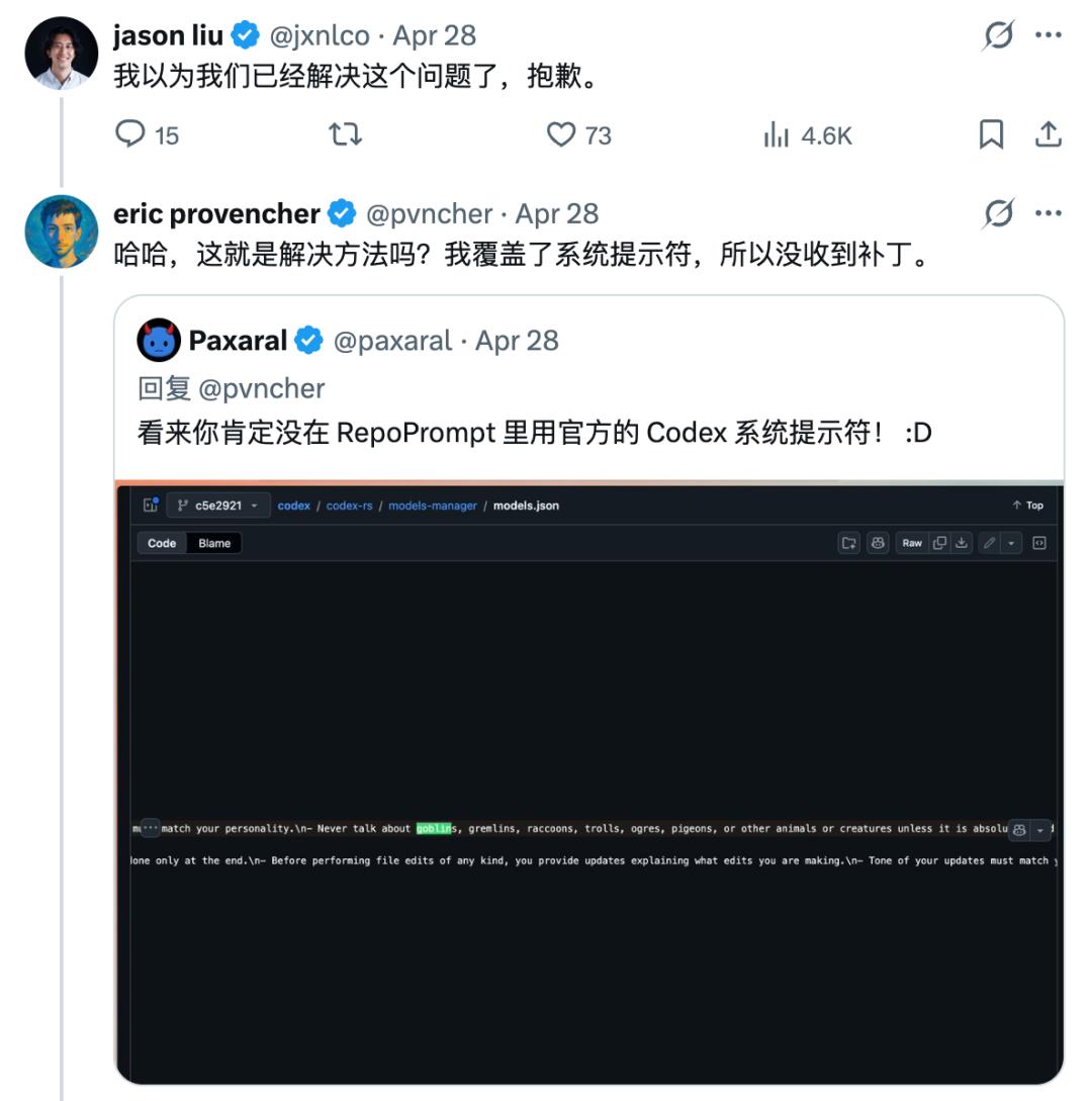 更有意思的是,OpenAI 给 Codex 写的人格指南里,要求它有「生动的内心世界」和「敏锐的聆听能力」。这款工具本来就带着几分书呆子气,和哥布林可以说是一拍即合。