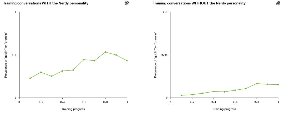 他们同时追踪了两组数据:一组对话带了书呆子提示词,一组没带。按理说,哥布林腔调只该在第一组里增长。但结果是,两组的增长曲线几乎贴在一起,步调一致地往上走。
